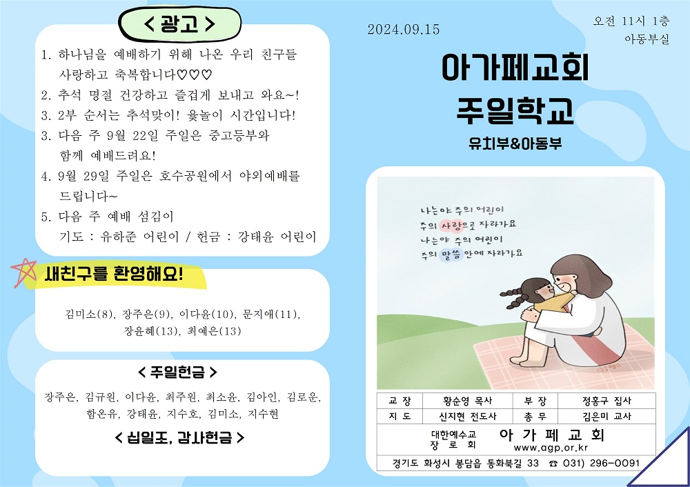 ) F. 031-296-0091 / 부설 아가페어린이집 : 031-298-9153