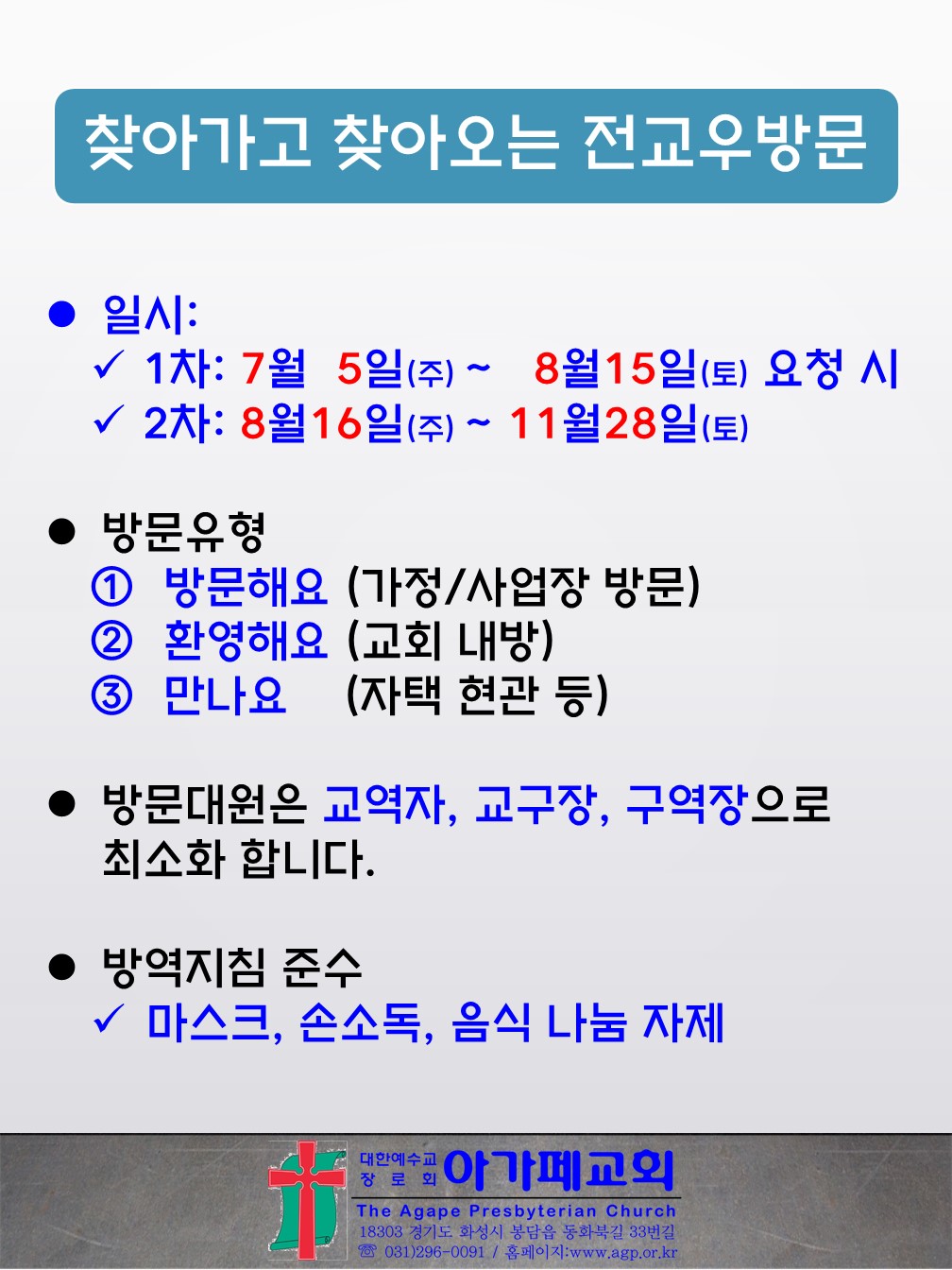 샬롬! 대한예수교장로회 아가페교회에 오신걸 진심으로 환영합니다.