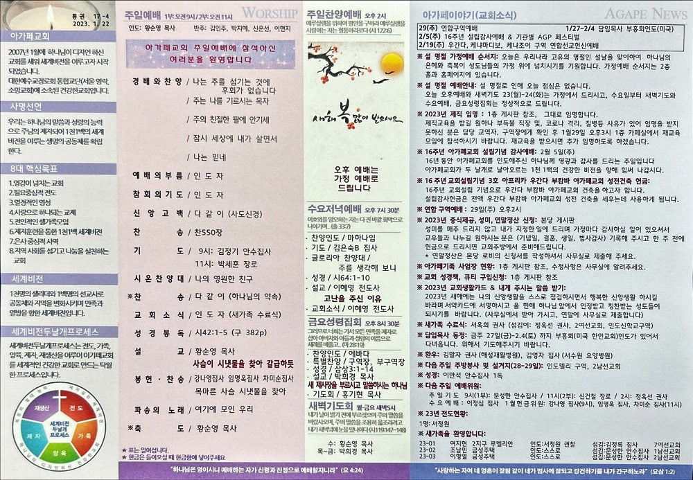 샬롬! 대한예수교장로회 아가페교회에 오신걸 진심으로 환영합니다.