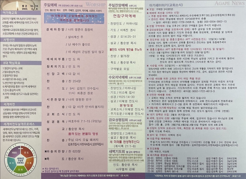 샬롬! 대한예수교장로회 아가페교회에 오신걸 진심으로 환영합니다.