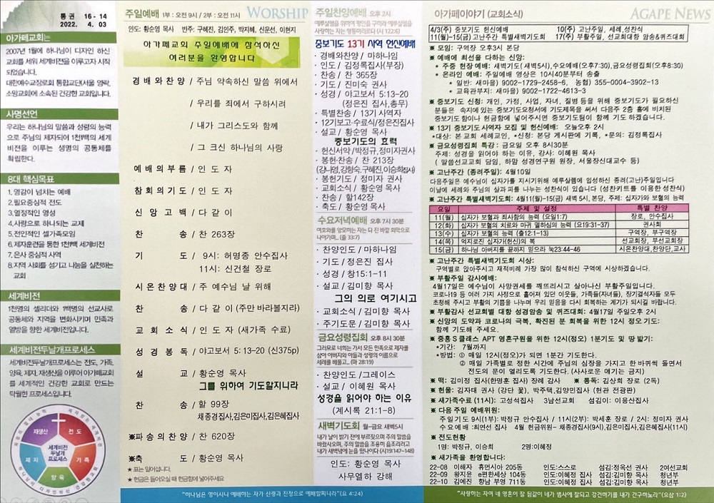 샬롬! 대한예수교장로회 아가페교회에 오신걸 진심으로 환영합니다.