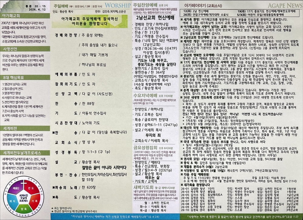 샬롬! 대한예수교장로회 아가페교회에 오신걸 진심으로 환영합니다.
