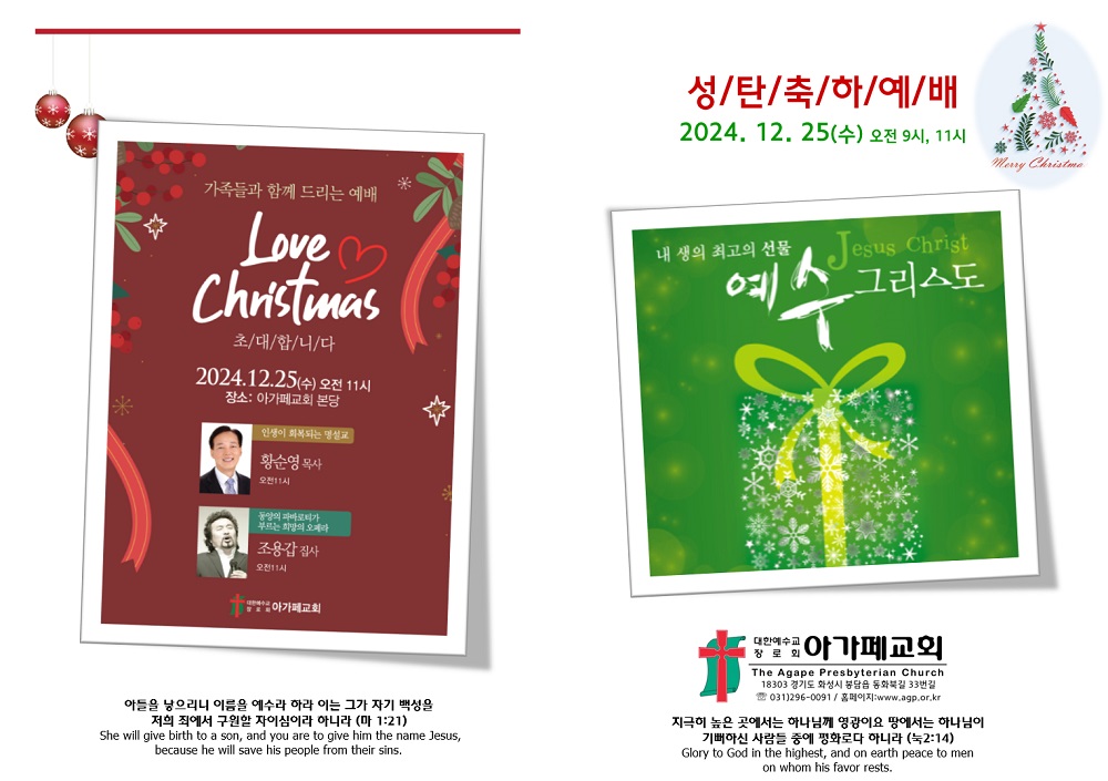 샬롬! 대한예수교장로회 아가페교회에 오신걸 진심으로 환영합니다.