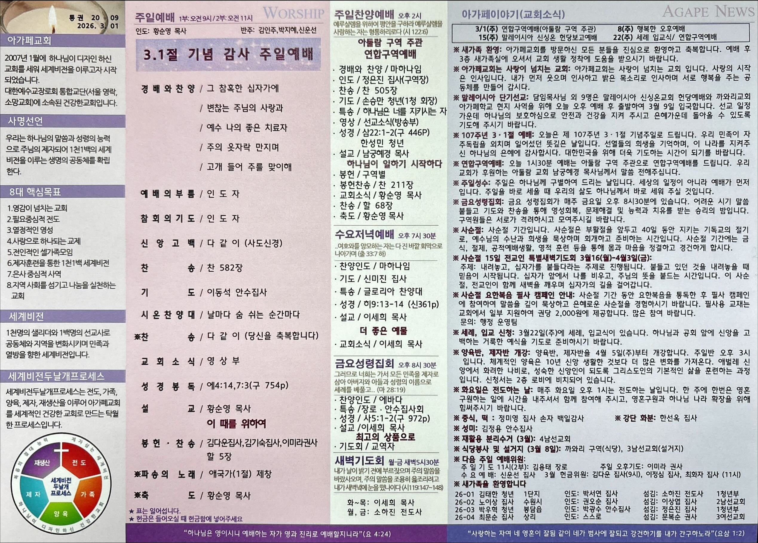 샬롬! 대한예수교장로회 아가페교회에 오신걸 진심으로 환영합니다.